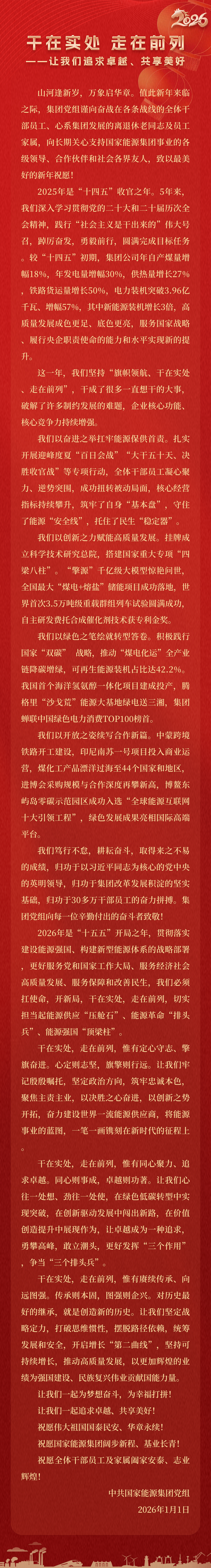 國家能源集團胸懷“國之大者”,增產(chǎn)增供、穩(wěn)價穩(wěn)市,積極服從服務國家戰(zhàn)略、保障國家能源安全、助力國民經(jīng)濟穩(wěn)增長,推動煤炭安全綠色智能、煤電清潔高效穩(wěn)定、現(xiàn)代煤化工高端多元低碳、運輸物流協(xié)同一體、新能源多元創(chuàng)新規(guī)?;l(fā)展,全力擔當能源強國頂梁柱,能源供應壓艙石,能源革命排頭兵。